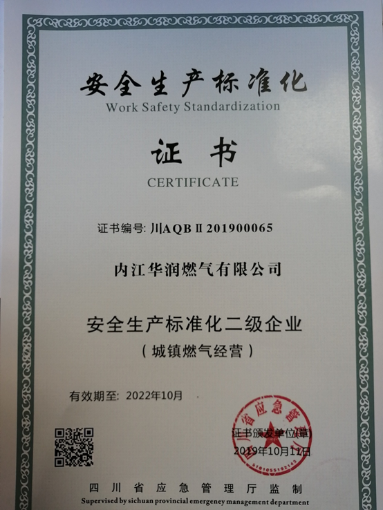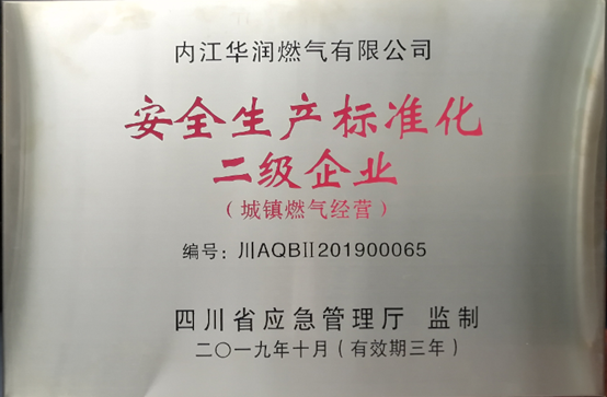 根據(jù)四川省應(yīng)急管理廳公告(2019年第37號),內(nèi)江華潤燃?xì)庥邢薰就ㄟ^評審,被確定為“安全生產(chǎn)標(biāo)準(zhǔn)化二級企業(yè)”,并授予獎(jiǎng)牌和證書。