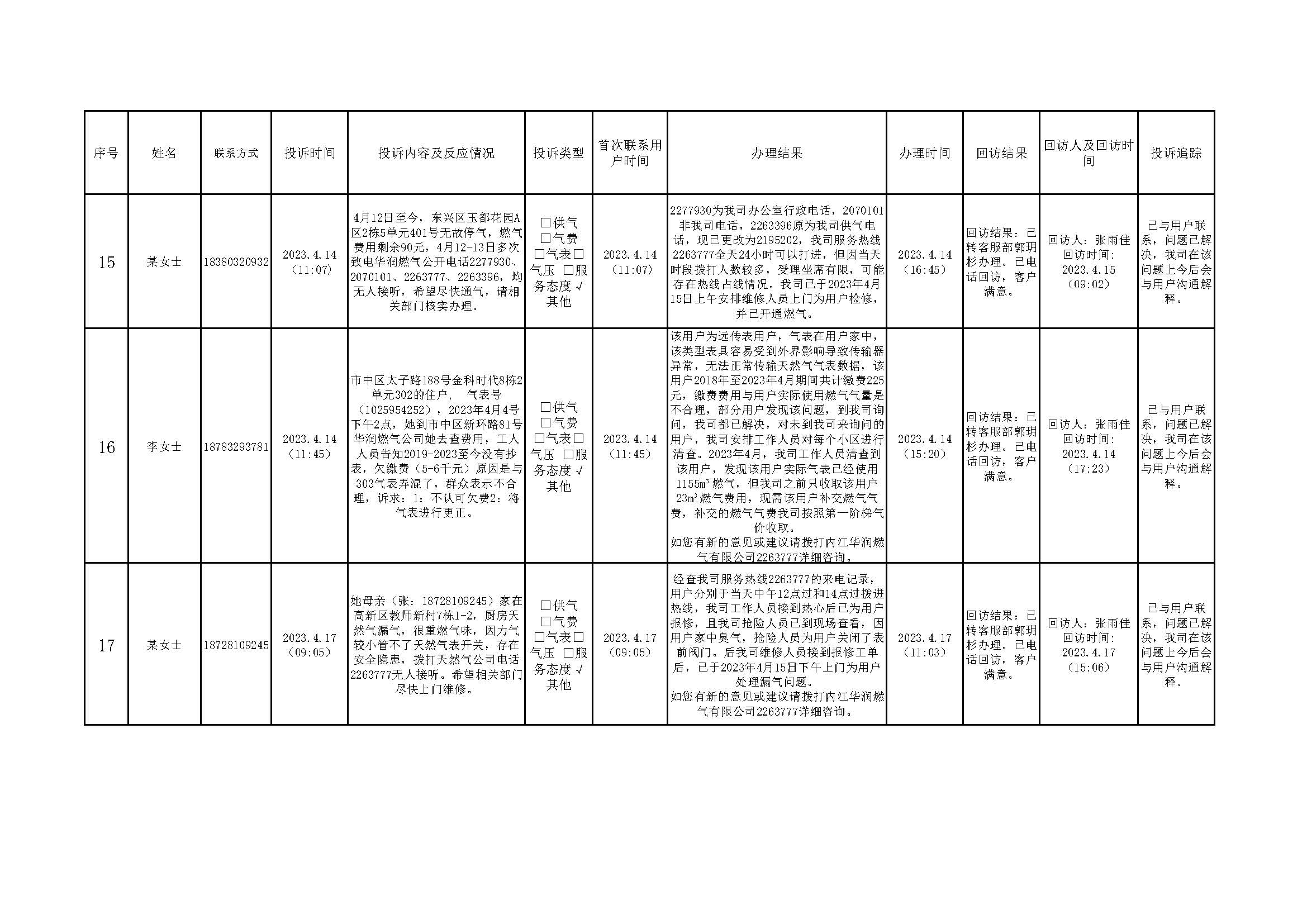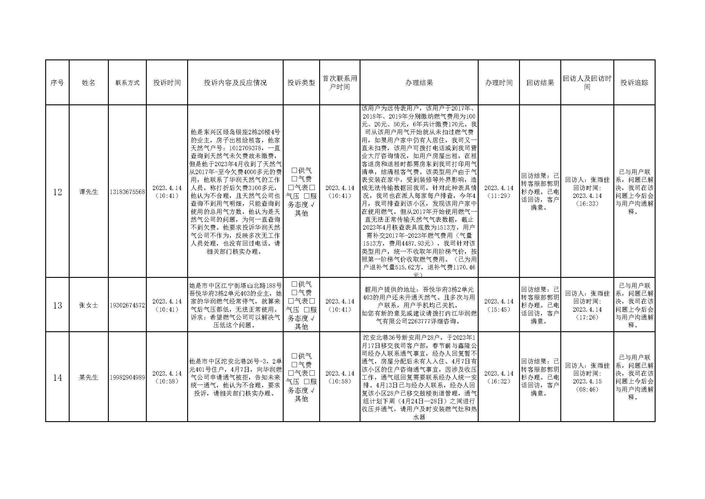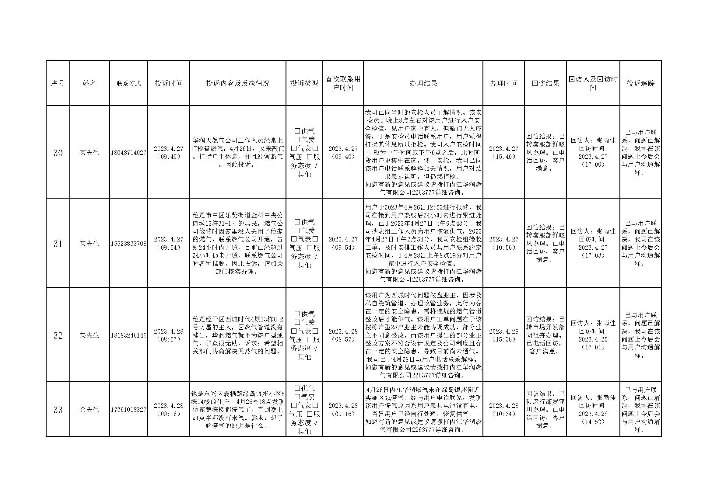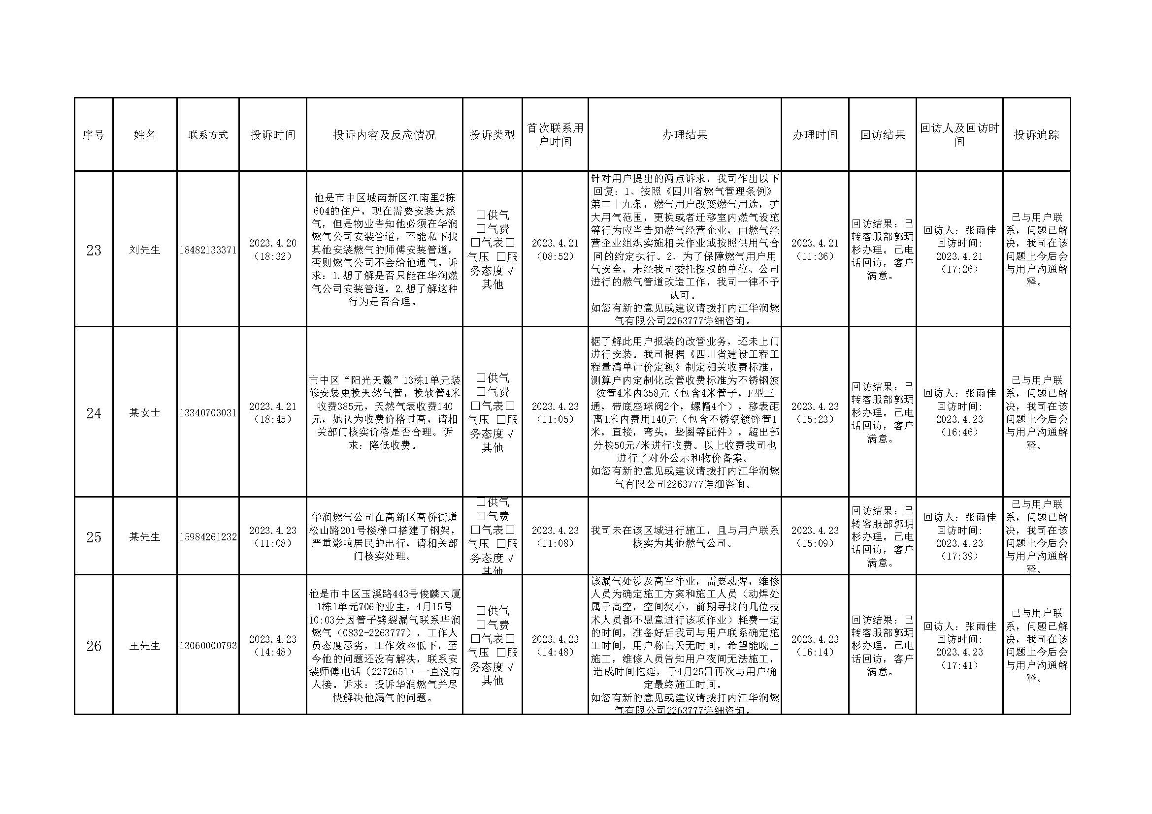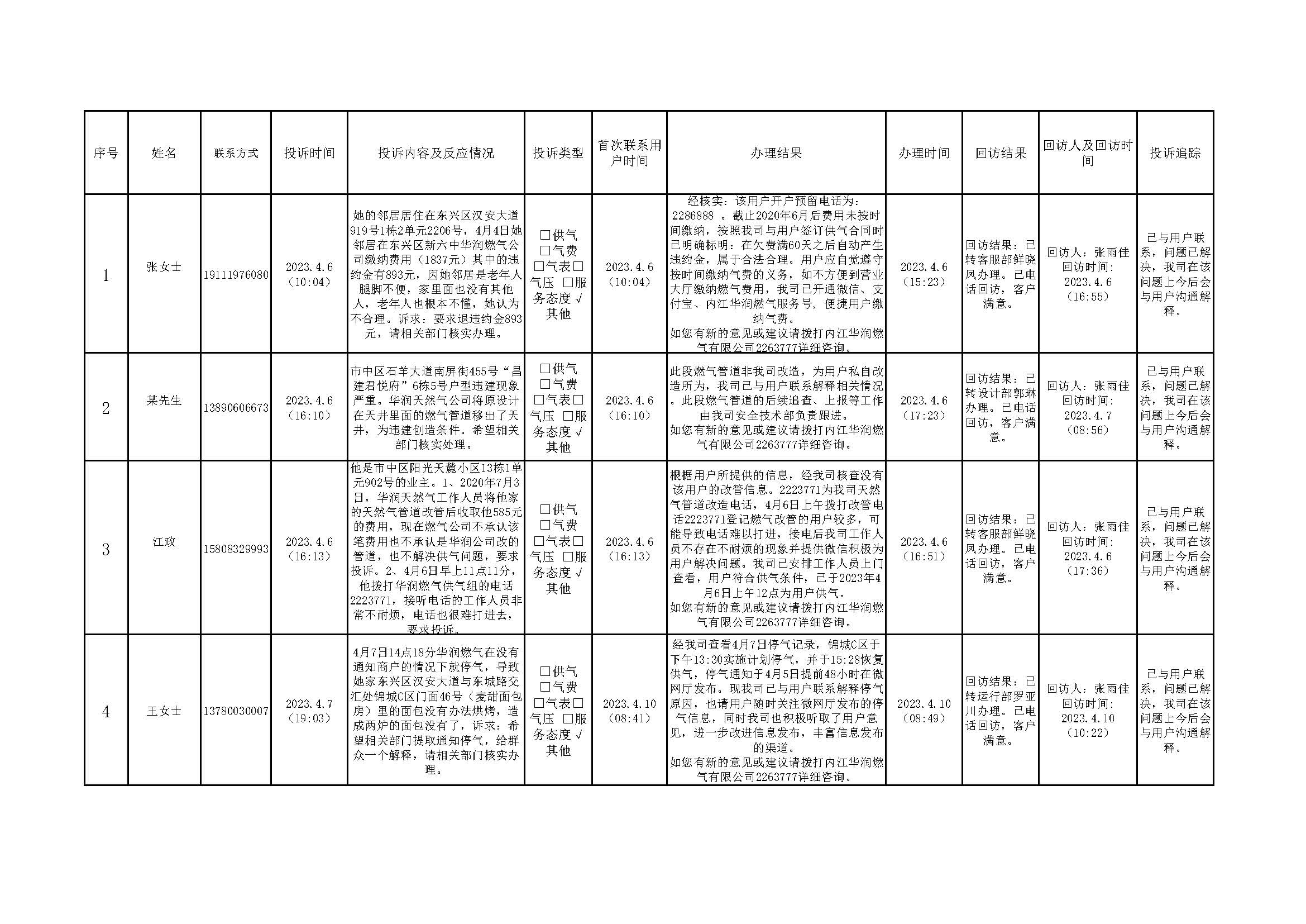 2023年4月投訴辦理及回訪情況