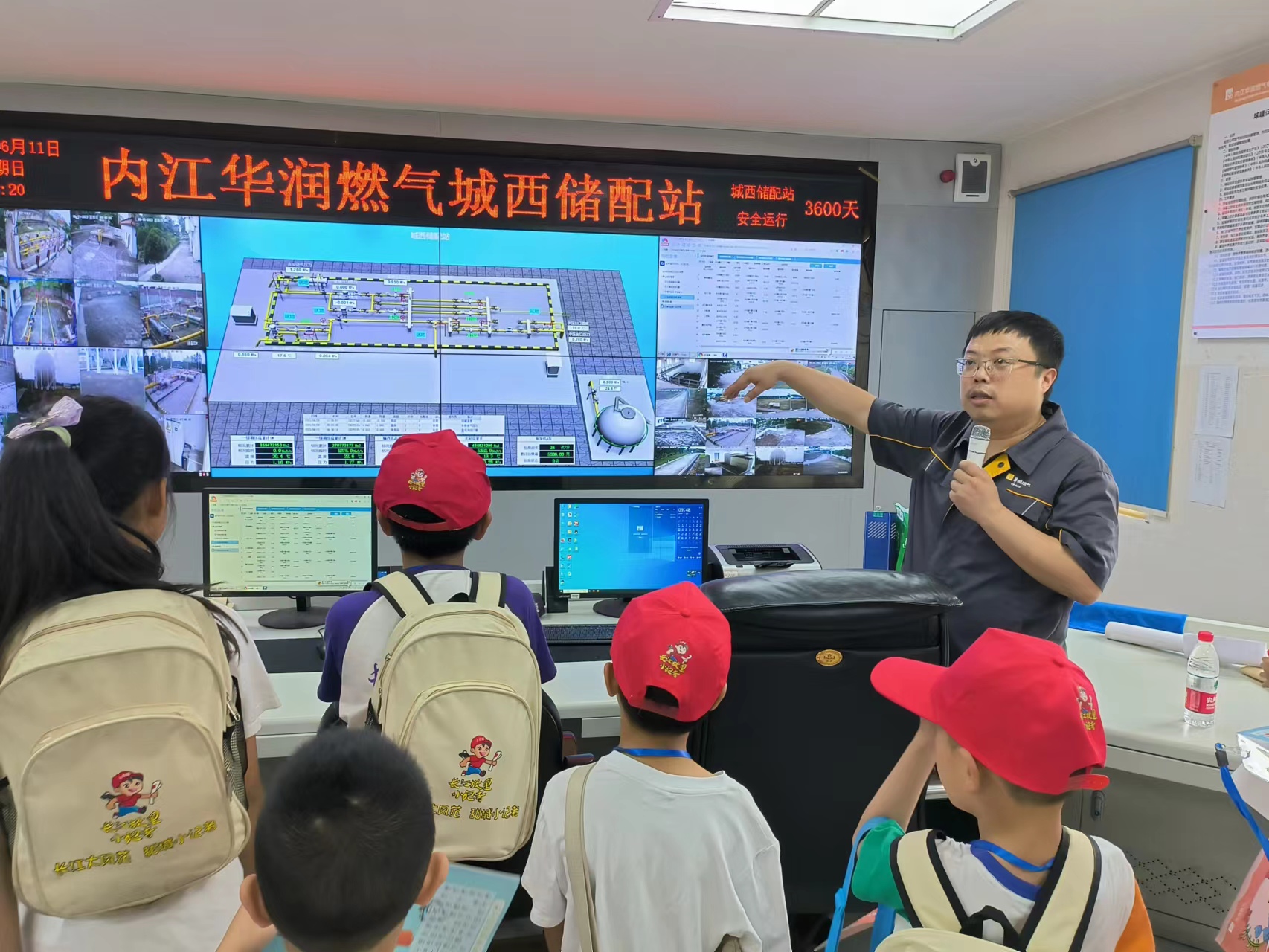 隨后工作人員向他們介紹了天然氣是怎么從地下通過管道工藝達到千家萬戶,介紹了場站自動化監(jiān)測和安全管理系統(tǒng),也介紹了突發(fā)情況是怎么被預(yù)防、應(yīng)急措施是怎樣制定和演練的,同時也向孩子們傳授了關(guān)于燃?xì)獾幕局R,如天然氣的性質(zhì)、燃?xì)獾娘L(fēng)險和安全使用注意事項等。